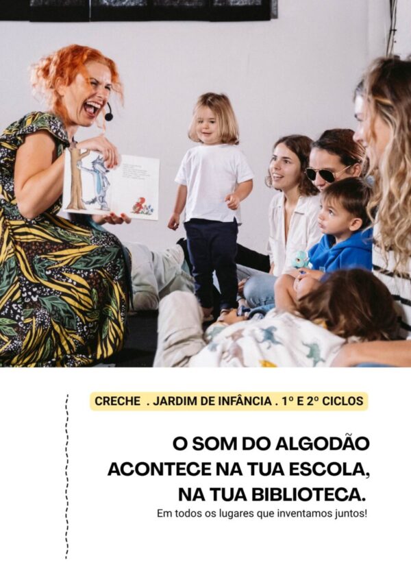 As nossas propostas integram espetáculos desde a primeira infância até à idade adulta. Usamos o livro como alimento, a palavra como gesto performativo, a música como espaço de liberdade. O Som do Algodão disponibiliza, ainda, oficinas criativas de exploração para os mais novos e ações de formação certificadas para professores, educadores e agentes culturais.